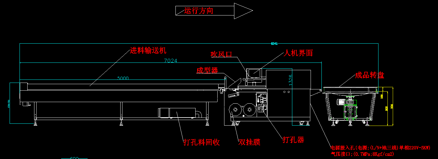 操作流程:人工在工作臺把蔬菜放入輸入輸送機-》葉菜包裝機完成自動打孔-》自動裹膜è廢料收集-》制袋成型-》橫封封切-》成品輸出-》進入旋轉接料盤